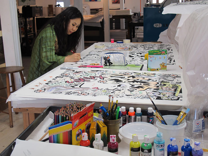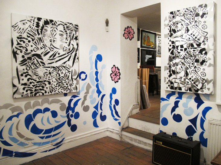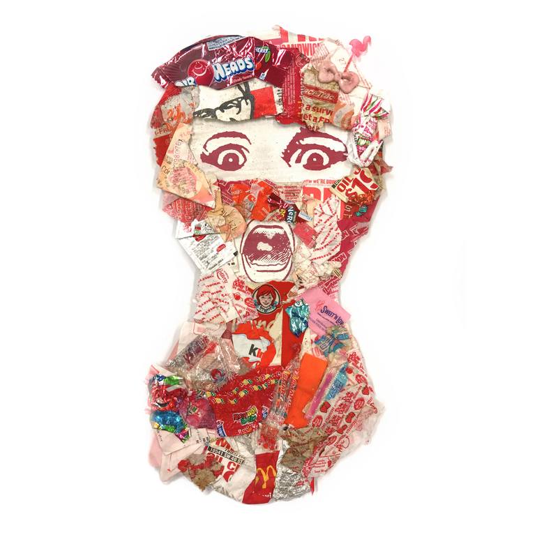 Con simbología y estética japonesa, utiliza distintas técnicas como acrílicos, pintura en aerosol, superposición de imágenes y sin fin de materiales que le permiten trabajar sobre temas que retratan la sexualidad, la feminidad y la ironía.