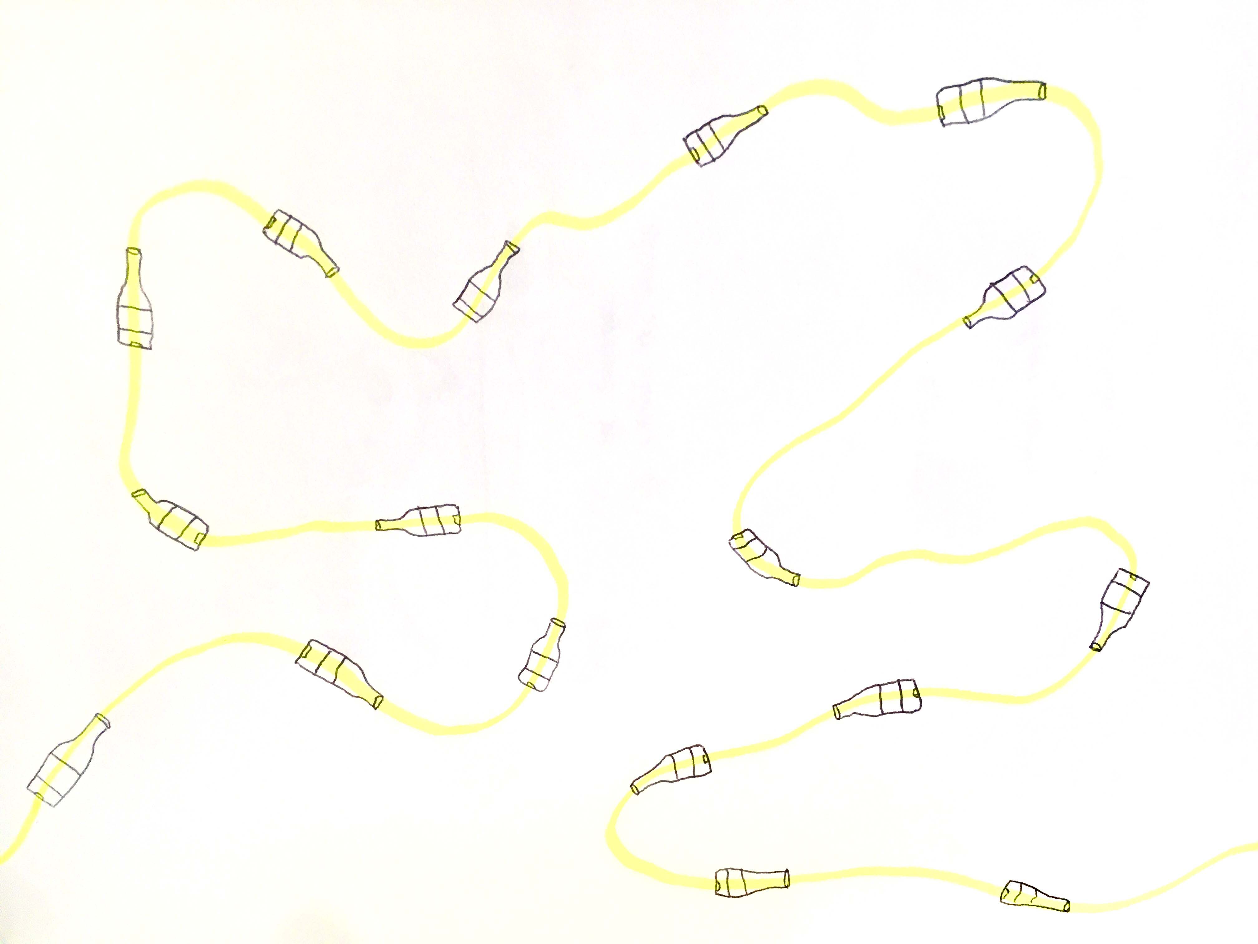 Realizando la investigación, descubrí en fotografías del archivo familiar que estas botellas fueron utilizadas en la boda de mis padres (05/09/95) y que en total, pasaron 25 años y 25 días hasta el momento en que las encontré en la parte trasera de lo que solía ser un restaurante (30/09/20). La pieza surge desde la idea de flotar o de traer a la superficie algo que permaneció mucho tiempo en un territorio de alguna manera “sumergido”, y conceptualmente desde la idea de la boya como un objeto visible pero con una parte anclada en el fondo, que metafóricamente, lo relaciono con la memoria y el recuerdo de estos mismo objetos.